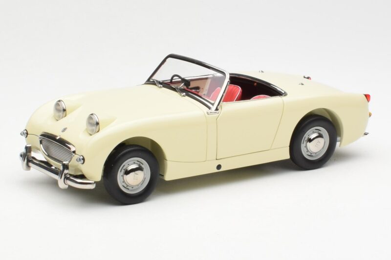 The Austin-Healey Sprite Mk I Open Old English Blanc Kyosho 1:18 is crafted from Métal. Die-cast zinc alloy body with detailed plastic parts, rubber tires, and high-quality paint finish. Die-cast models are known for their weight, durability, and realistic feel.