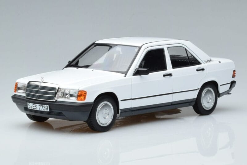 The Mercedes 190 E W201 Blanc Norev 1:18 is crafted from Métal. Die-cast zinc alloy body with detailed plastic parts, rubber tires, and high-quality paint finish. Die-cast models are known for their weight, durability, and realistic feel.