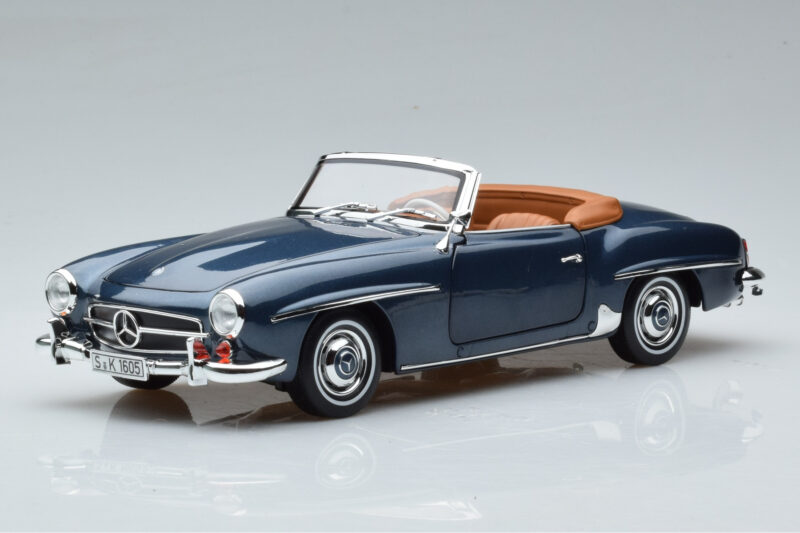 The Mercedes 190 SL W121 Roadster Bleu Norev 1:18 is crafted from Métal. Die-cast zinc alloy body with detailed plastic parts, rubber tires, and high-quality paint finish. Die-cast models are known for their weight, durability, and realistic feel.
