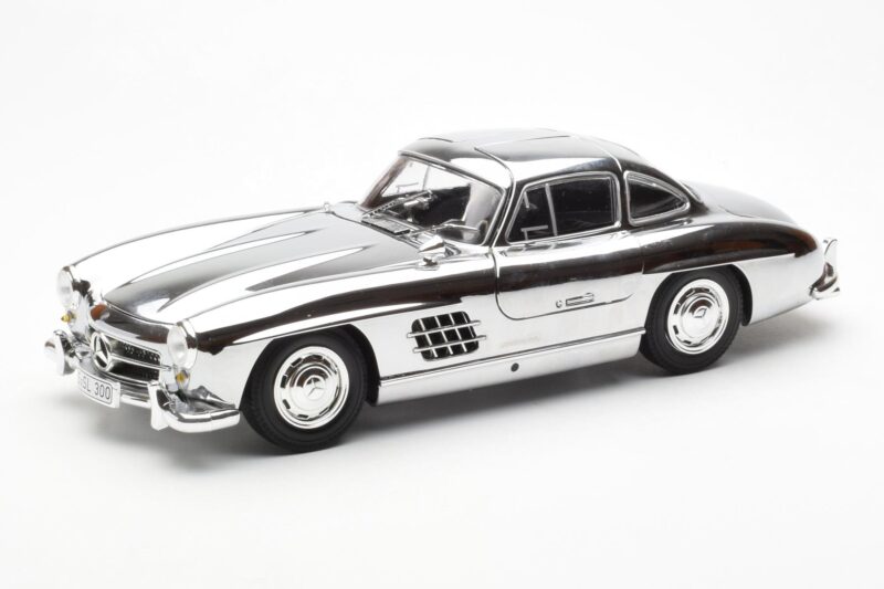 The Mercedes 300 SL W198 Chrome Minichamps 1:18 is crafted from Métal. Die-cast zinc alloy body with detailed plastic parts, rubber tires, and high-quality paint finish. Die-cast models are known for their weight, durability, and realistic feel.