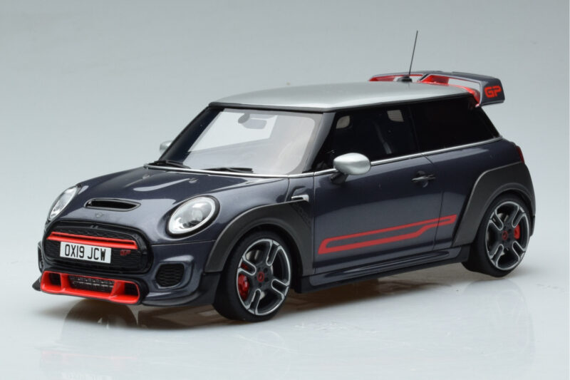 A 1:18 scale model measures approximately 25-28 cm (approximately 10-11 inches). The Mini John Cooper Works GP F56 Gris Otto 1:18 is perfect for display in a glass cabinet or on a shelf.