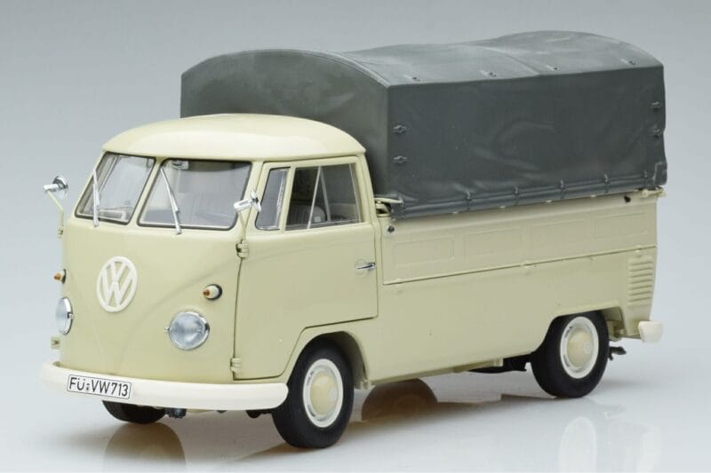 The Volkswagen T1b Pickup Schuco 1:18 is crafted from Métal. Die-cast zinc alloy body with detailed plastic parts, rubber tires, and high-quality paint finish. Die-cast models are known for their weight, durability, and realistic feel.